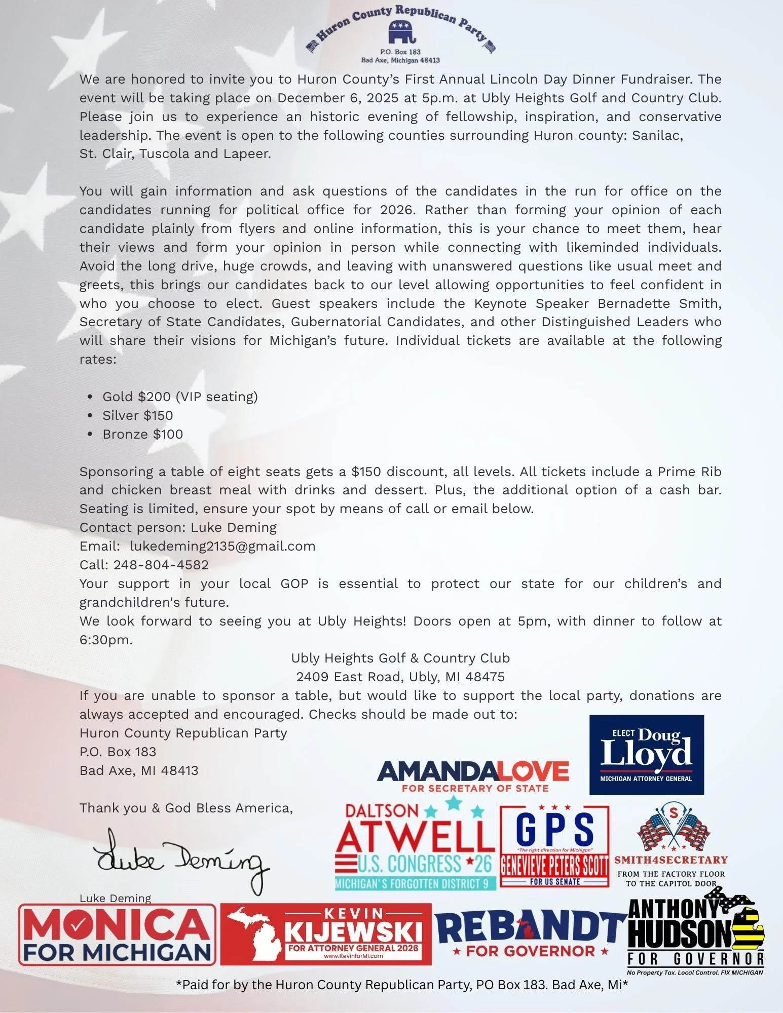 Questions? Contact Luke Deming, Chair of the Huron County Republican Party. Call 248-804-4582.